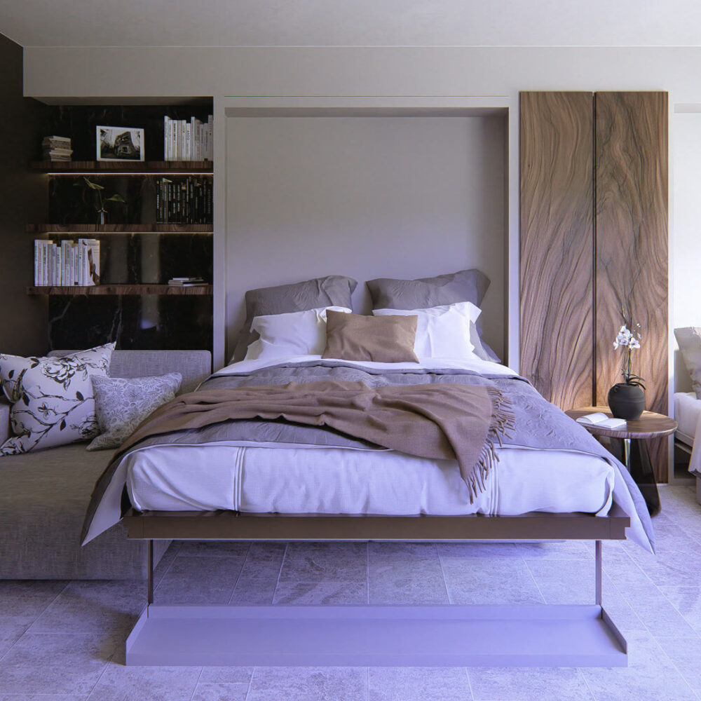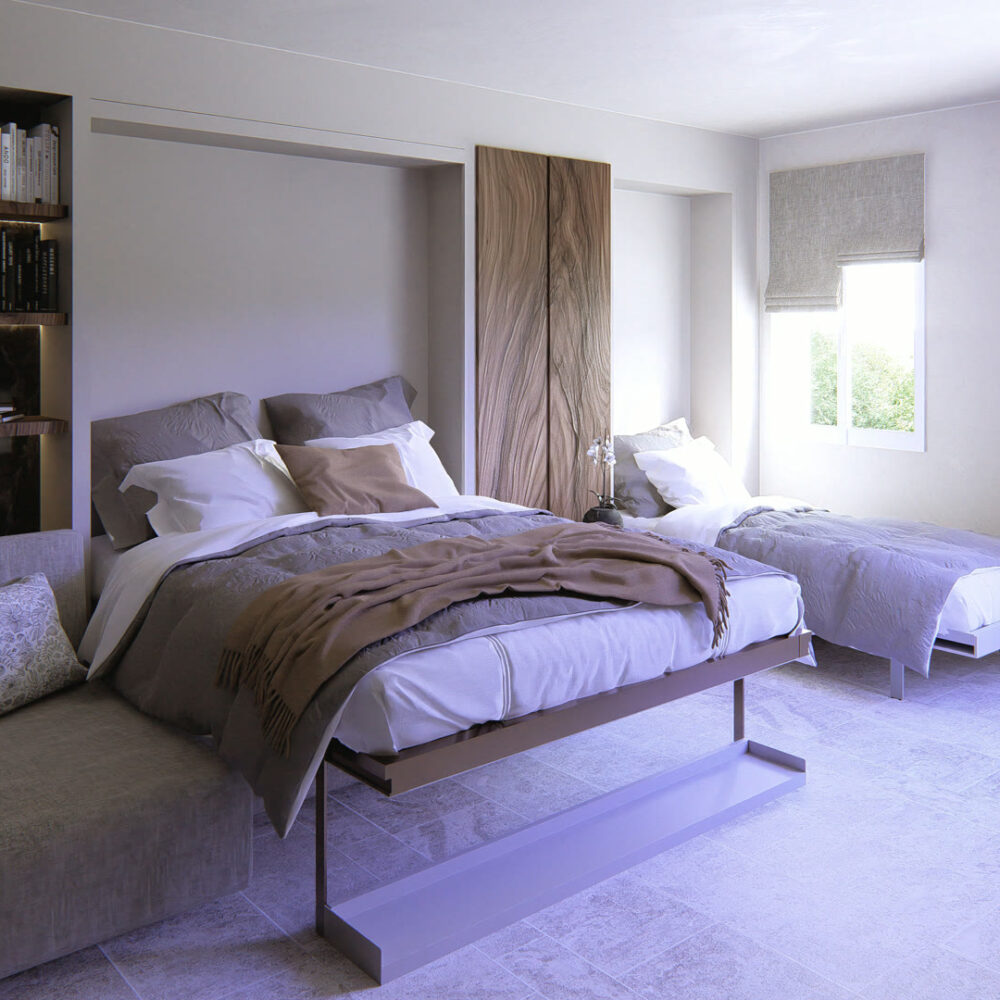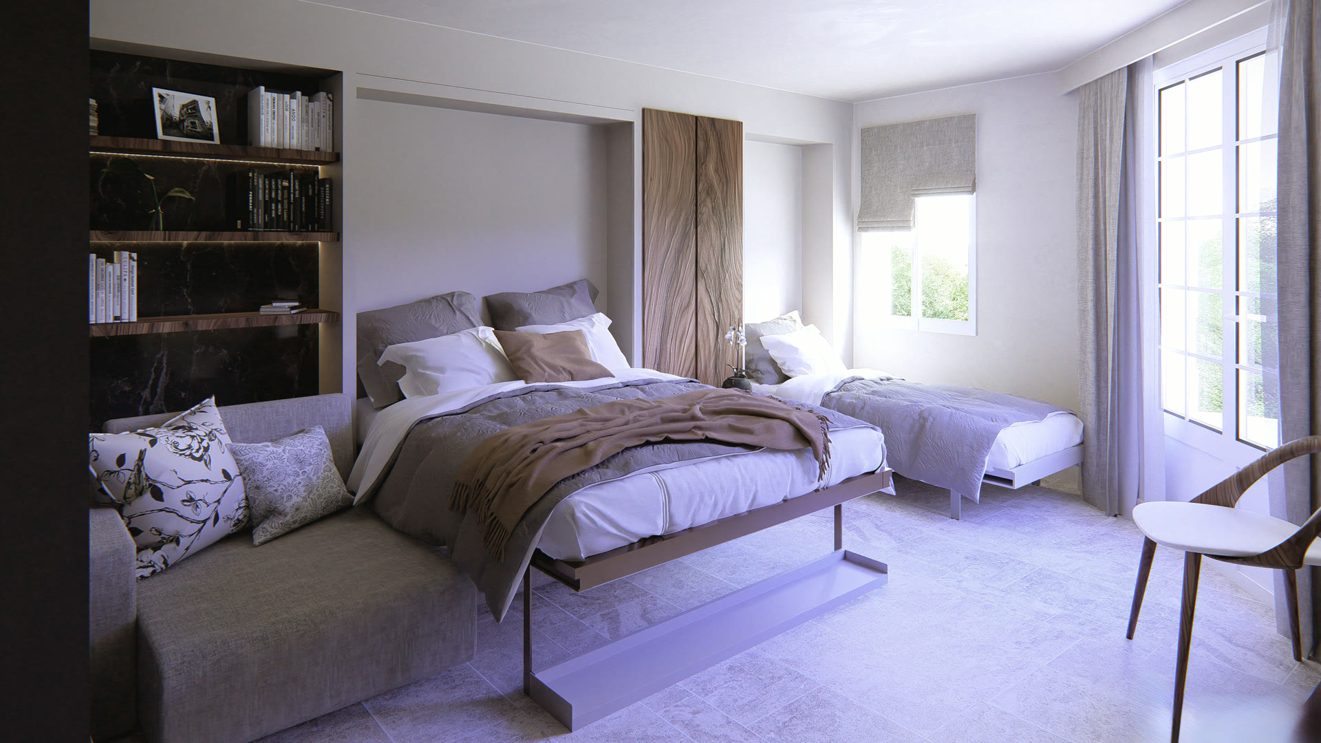 • Un lit simple dissimulé derrière le bureau se déploie sans effort, transformant l’espace en véritable chambre.