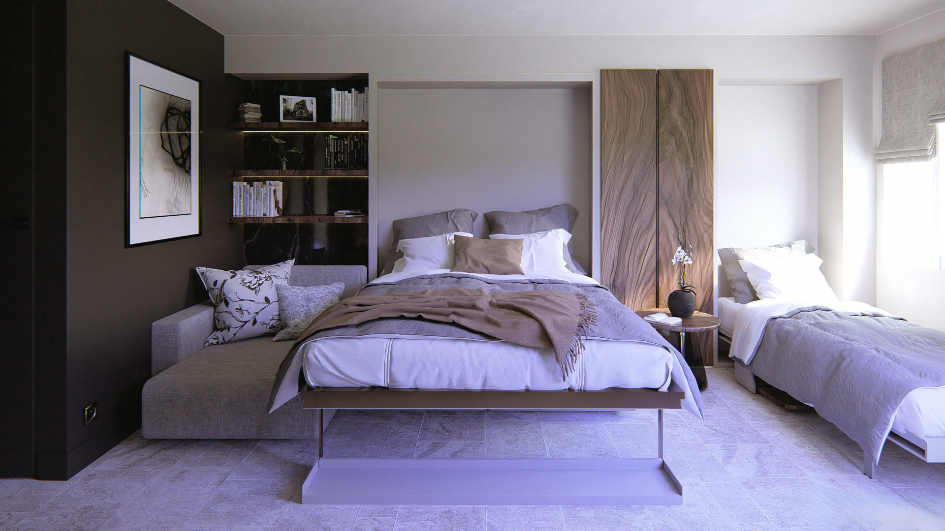 • Un canapé-lit double escamotable s’intègre avec naturel dans la composition, offrant un couchage généreux.